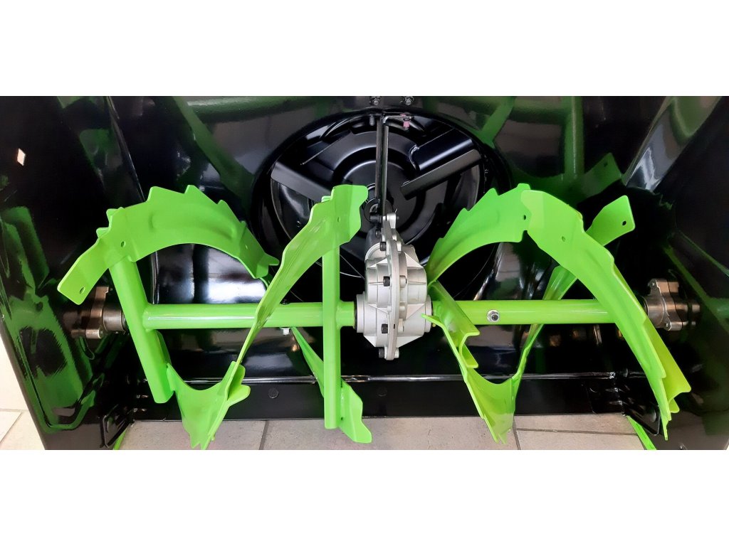 Dvoustupňová AKU sněhová fréza znatelně zvyšuje efektivitu úklidu sněhu ve srovnání s jednostupňovými AKU sněhovými frézami. Frézovací šnek nejdříve zpracuje a nasměruje vrstvu sněhu k výhozovému ventilátoru, který sníh vymrští až do vzdálenosti až 13 metrů. Frézovací mechanizmus a nabírací šnek (1.stupeň) je vyroben z kvalitní, odolné vysocelegované oceli tak, aby se při zpracovávání vrstvy sněhu nekroutil.