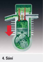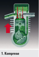 Komprese: Píst se pohybuje nahoru, v klikové skříni vzniká podtlak. Ten nasává část palivové směsi ze sacího kanálu přes obtokový kanál v hlavě válce.