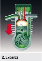 Sání: Píst se pohybuje dolů, stejně jako při expanzi je směs obtokovým kanálem znovu vytlačována z klikové skříně zpět do sacího kanálu.