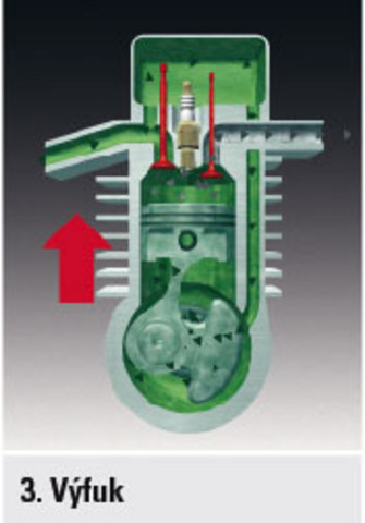Výfuk: Píst se pohybuje nahoru, stejně jako při kompresi je směs obtokovým kanálem znovu nasávána ze sacího kanálu do klikové skříně.