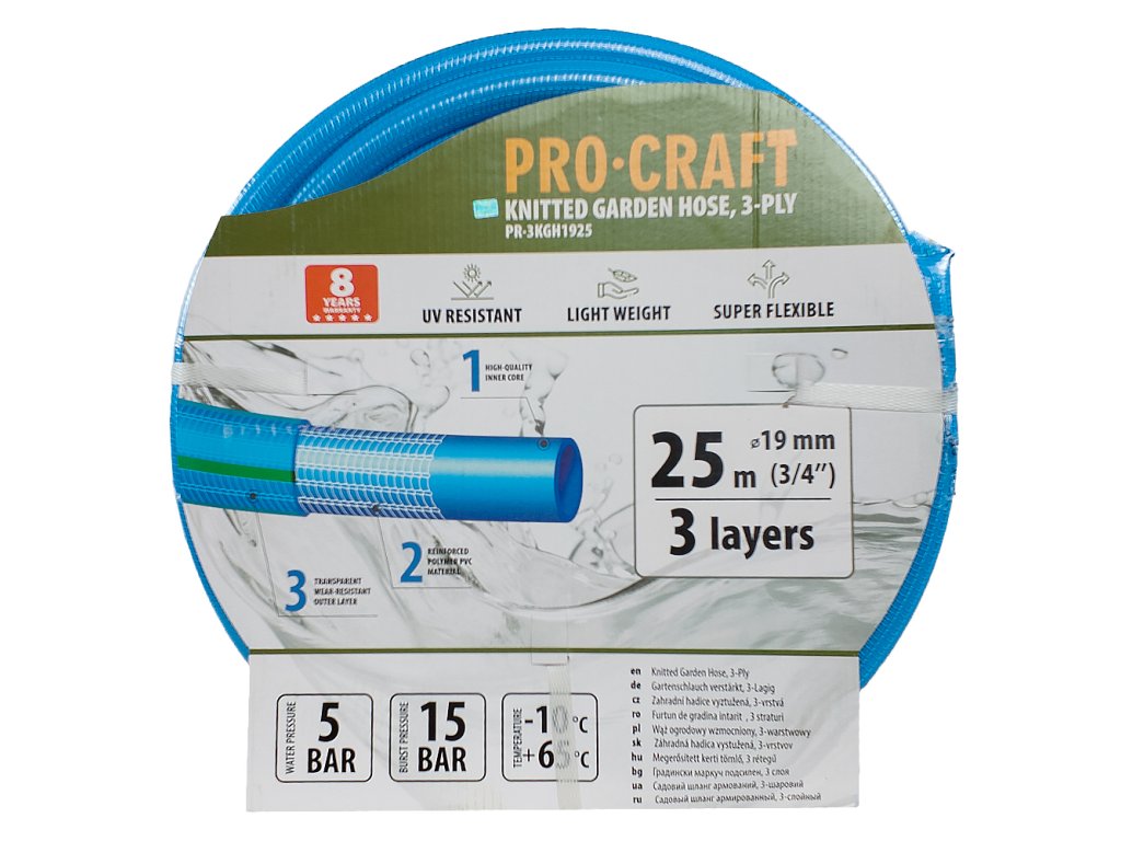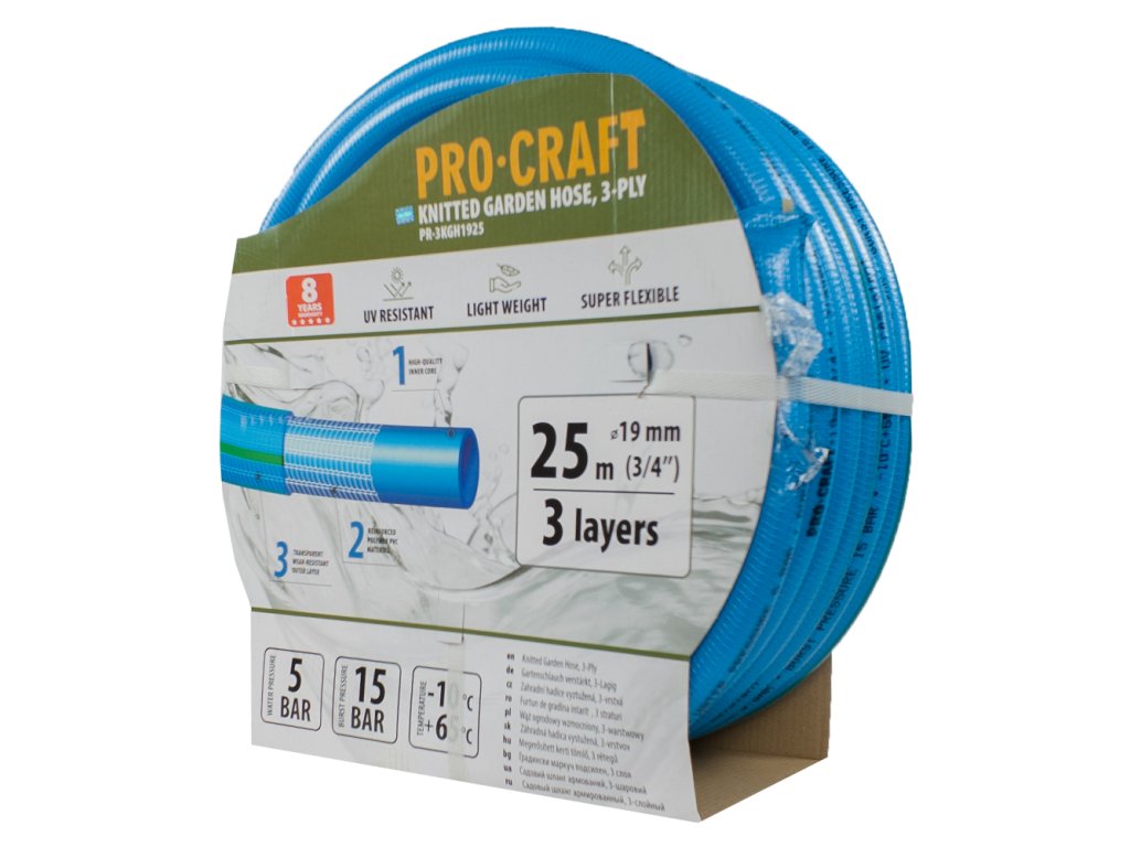 Zahradní hadice Procraft je určena k zalévání a zavlažování zahrad, pozemků. Zesílená třívrstvá zahradní hadice s tkanou výztuhou má vysokou životnost až 8 let. Kvalitní zpracovaní hadice zajišťuje vysokou odolnost UV záření, povětrnostním vlivům a proti teplotám (-10 až +65). Hadice je velmi flexibilní, robustní a odolná proti zlomení.