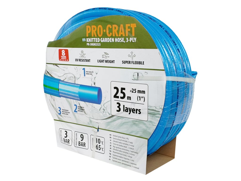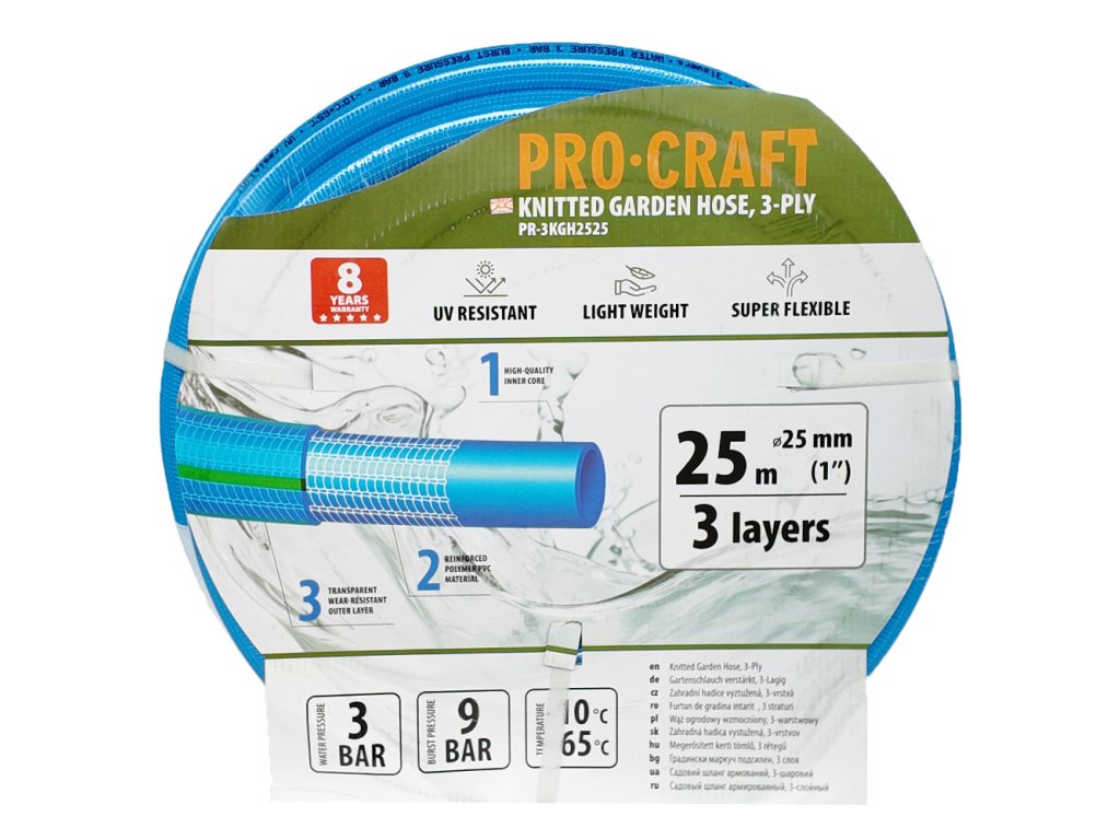 Zahradní hadicí Procraft PR-3KGH2525 3 vrstvy, 1" 25 m Tlakuvzdorná, trvale elastická a tvarově stabilní Odolná UV záření a povětrnostním vlivům Délka hadice 25…