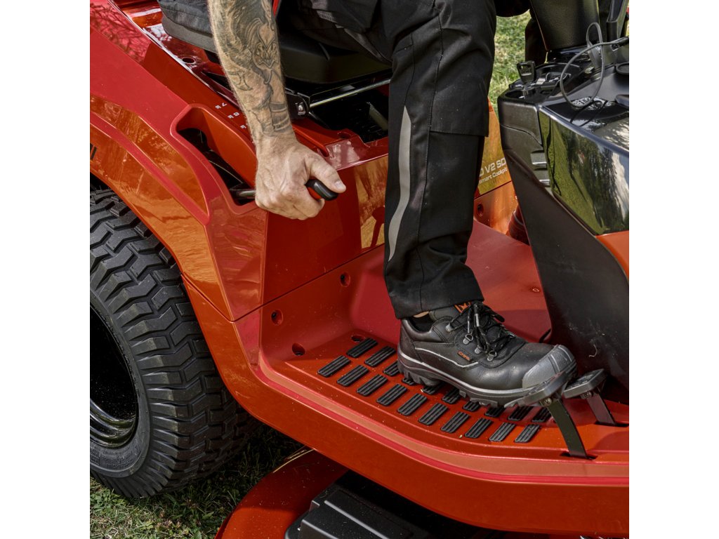 Údržba rozsáhlých travních ploch je také potěšením s velkými 20palcovými zadními koly, která hladce absorbují nerovnosti v terénu. Pedály pro jízdu vpřed a vzad jsou ergonomicky uspořádány vedle sebe pro intuitivní řízení. Zahradnímu traktoru snadno doplníte provozní kapaliny díky externímu hrdlu palivové nádrže. Nízký schod a velkorysý prostor pro nohy usnadňují nastupování a práci.