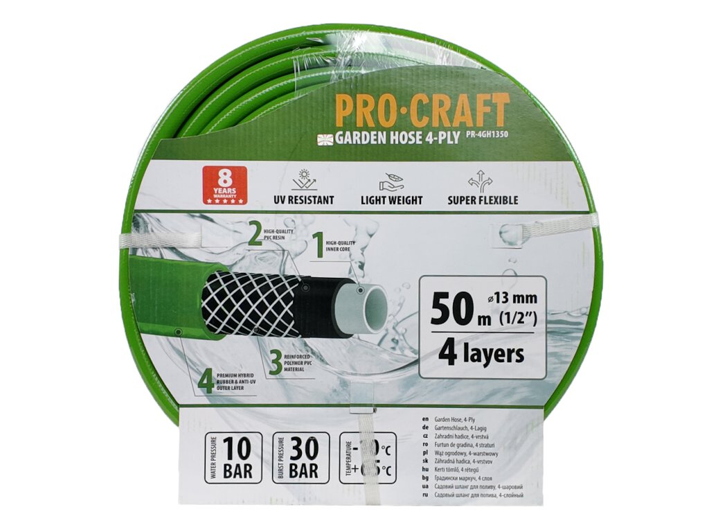 Zahradní hadice Procraft je určena k zalévání a zavlažování zahrad, pozemků. Zesílená 4-vrstvá zahradní hadice s tkanou výztuhou má vysokou životnost až 8 let. Kvalitní zpracovaní hadice zajišťuje vysokou odolnost UV záření, povětrnostním vlivům a proti teplotám (-10 až +65). Hadice je velmi flexibilní, robustní a odolná proti zlomení.
